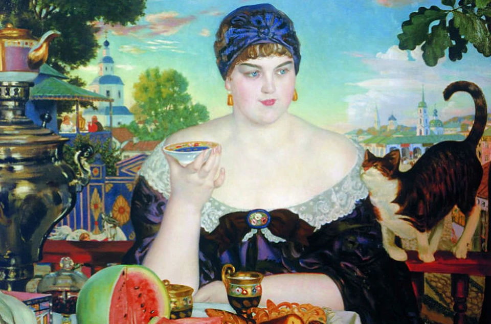 Здесь гостей встречает самая известная картина мастера "Купчиха за чаем". Моделью для этого произведения стала Галина Адеркас, баронесса из дворянского рода из Астрахани — малой родины живописца. Когда Кустодиев познакомился с ней, она была студенткой-медичкой, потом уже стала актрисой музыкального театра. А кошка, которая так ластится к купчихе, списана с домашней питомицы мастера.